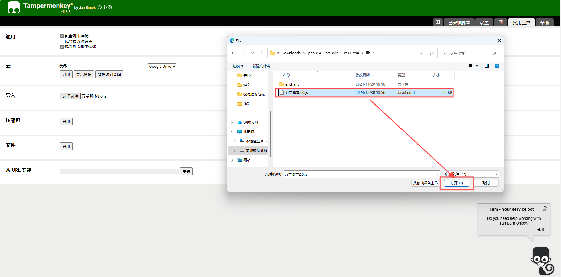 4. 导入下载好的万学网助手 2.0 的 JS 文件。